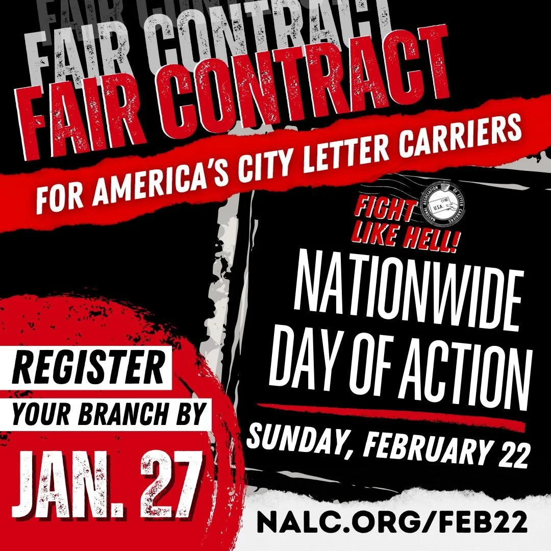 Calling All NALC Branches! On Sunday, Feb. 22, letter carriers across the nation will rally for a fair contract. Together, we will deliver a clear, unified, and powerful message as we prepare to open contract negotiations with the Postal Service. Unite. Mobilize. FIGHT LIKE HELL. ✊ More details »