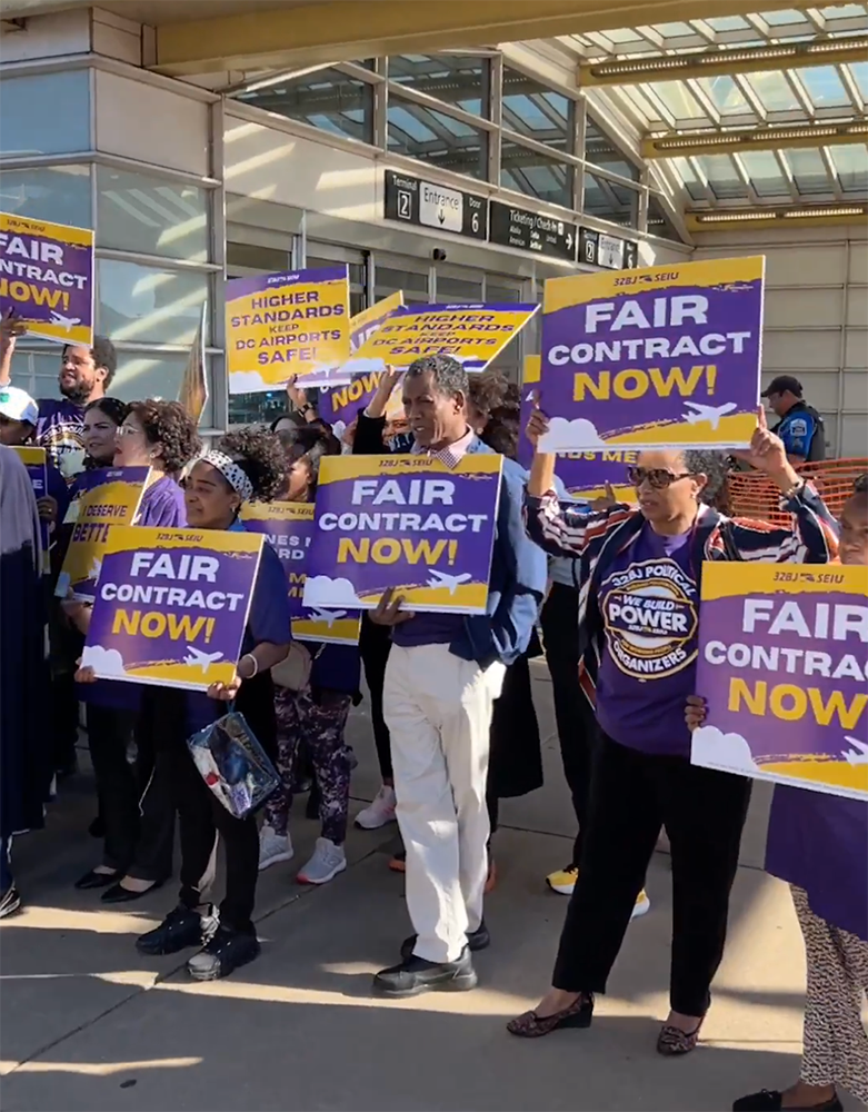 Contracted service workers with 32BJ SEIU at Dulles and DCA Airports rallied last week for livable wages and benefits.