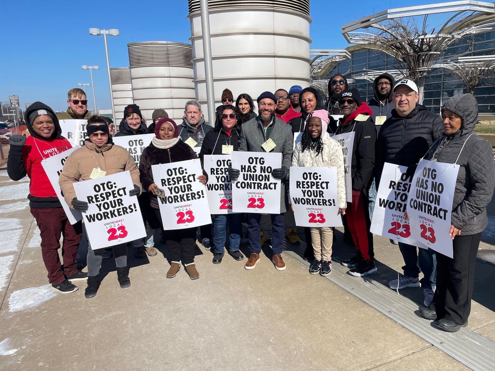 Left: OTG workers at National Airport with UNITE HERE Local 23 are rising up for respect, fair scheduling, wage increases, rights on the job, and a fair contract! DC Councilmember Robert White joined them on the picket line. Right: 32BJ SEIU was in attendance as Montgomery County Executive Marc Erlich signed the Trust Act into law last week.
